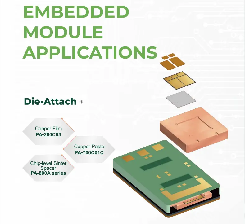 Die-Attach采用的我司PA-200C03铜膜具备导热性优异、价格低的优势;PA-700C系列湿贴烧结铜膏能够在250℃、20MPa的条件下实现芯片/基板可靠互连,兼容上一代烧结银的生产工艺流程与设备,相较于银膏具有优良的机械性能与成本优势,是大功率模块封装的理想解决方案;