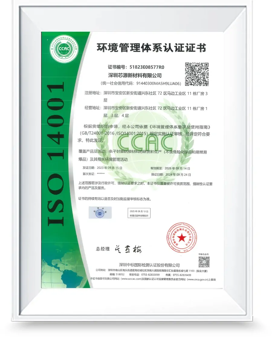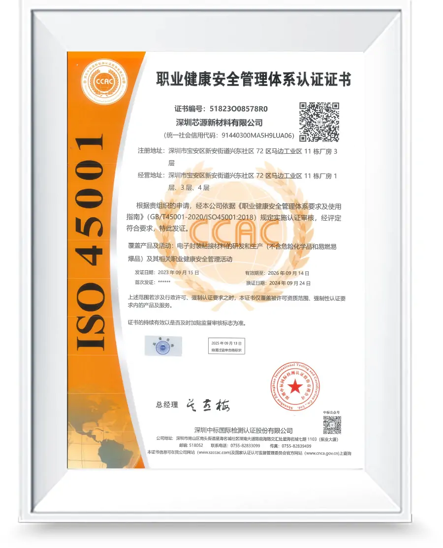 依据ISO 9001:2015 国际标准要求建立、实践质量管理体系,涵盖电子封装粘接材料的设计开发、生产制造、售后服务全生命周期管理,确保从原材料采购到终端交付的全程质量可控。